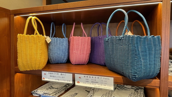 外湯巡りを楽しんで頂けるよう色とりどりの湯カゴ貸出しございます。