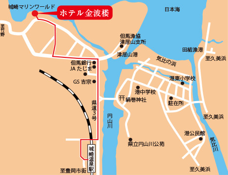 *Descendez à la gare de Kinosaki Onsen sur la ligne San’in, puis prenez un bus pendant 10 minutes ou un taxi pendant 5 minutes. Nous pouvons venir chercher les voyageurs en bus à la gare (réservation nécessaire).