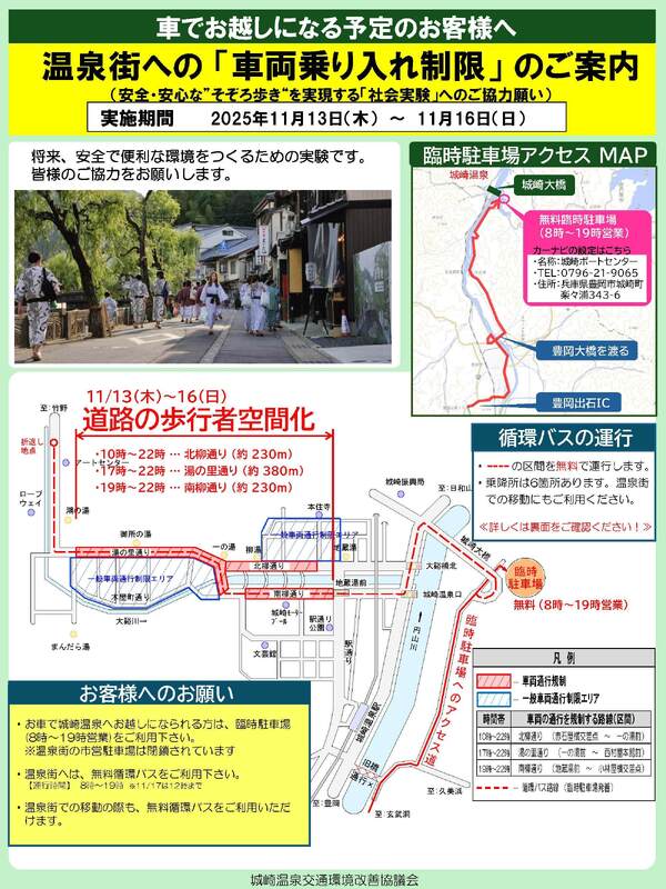 11/13~11/16まで城崎温泉街への 「車両乗り入れ制限」がございます。